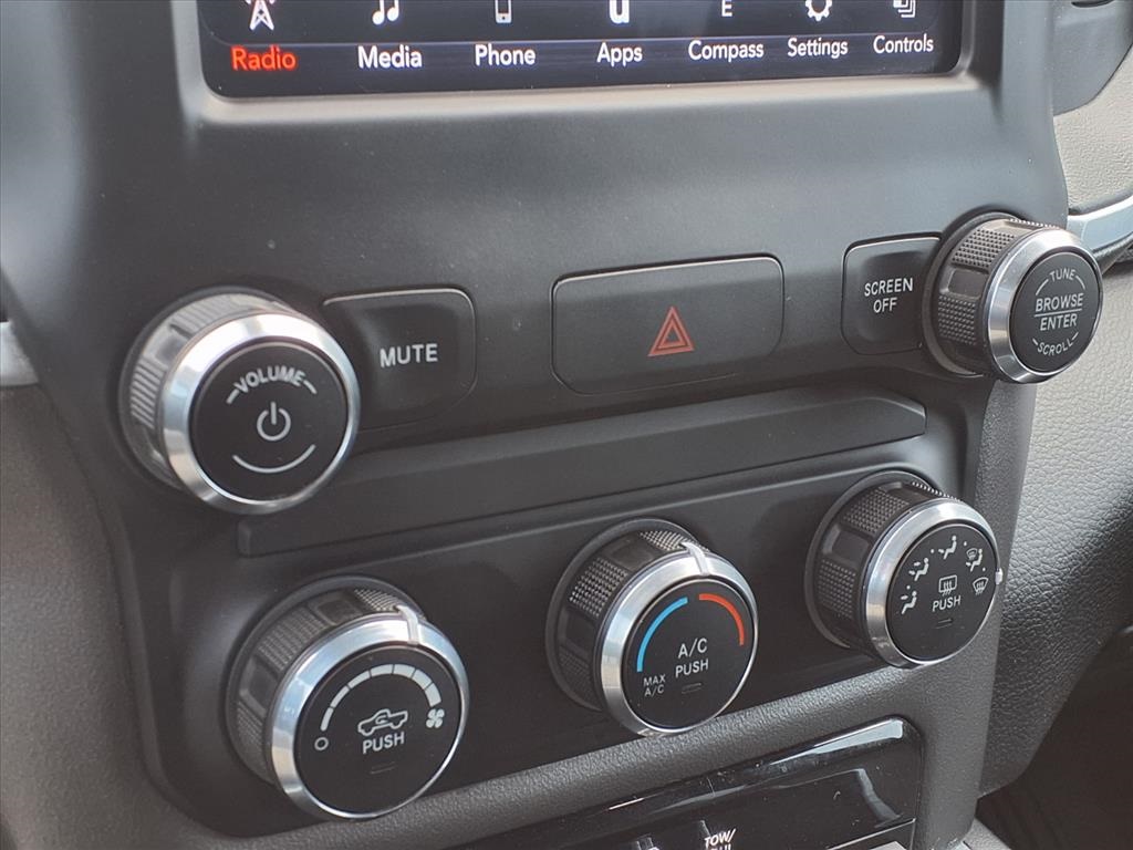 Lumbar Adjust, Power 8-Way Driver Seat, Power Adjustable Pedals, Radio: Uconnect 4 w/8.4" Display, Rear Dome w/On/Off Switch Lamp, Rear Power Sliding Window, Rear Window Defroster, SiriusXM Satellite Radio, Sun Visors w/Illuminated Vanity Mirrors, and Universal Garage Door Opener), Quick Order Package 23R Lone Star (Regional), 3 Rear Seat Head Restraints, 3.21 Rear Axle Ratio, 4 Way Front Headrests, 4-Wheel Disc Brakes, 48V Belt Starter Generator, 6 Speakers, ABS brakes, Air Conditioning, Alloy wheels, AM/FM radio, Brake assist, Bumpers: chrome, Cloth Bench Seat, Compass, Delay-off headlights, Driver door bin, Dual front impact airbags, Dual front side impact airbags, Electronic Stability Control, Front & Rear Rubber Floor Mats, Front anti-roll bar, Front Center Armrest w/Storage, Front fog lights, Front reading lights, Front Seat Back Map Pockets, Front wheel independent suspension, Fully automatic headlights, GPS Antenna Input, Heated door mirrors, Illuminated entry, Leather steering wheel, Low tire pressure warning, Occupant sensing airbag, Outside temperature display, Overhead airbag, Overhead console, Panic alarm, ParkView Rear Back-Up Camera, Passenger door bin, Passenger vanity mirror, Power door mirrors, Power steering, Power windows, Radio data system, Radio: Uconnect 3 w/5" Display, Rear 60/40 Folding Seat, Rear anti-roll bar, Rear seat center armrest, Rear step bumper, Remote keyless entry, Speed control, Split folding rear seat, Steering wheel mounted audio controls, Tachometer, Telescoping steering wheel, Tilt steering wheel, Traction control, Trip computer, Variably intermittent wipers, Voltmeter, and Wheels: 18" x 8" Cast-Aluminum Painted. Recent Arrival!