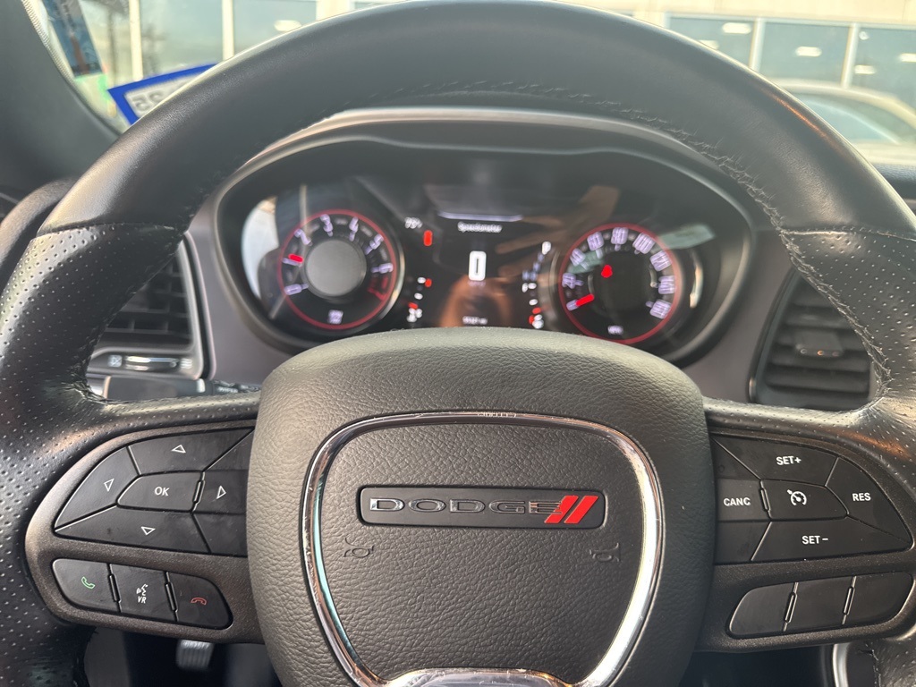 lle Badge, Compass, Delay-off headlights, Driver door bin, Driver vanity mirror, Dual front impact airbags, Dual front side impact airbags, Electronic Stability Control, Four wheel independent suspension, Front anti-roll bar, Front Bucket Seats, Front Center Armrest, Front dual zone A/C, Front License Plate Bracket, Front reading lights, Fully automatic headlights, Gloss Black I/P Cluster Trim Rings, Google Android Auto, GPS Antenna Input, Heated door mirrors, Houndstooth Cloth Sport Seat, Illuminated entry, Integrated Center Stack Radio, Integrated Voice Command w/Bluetooth, Leather Performance Steering Wheel, Leather Shift Knob, Low tire pressure warning, Media Hub (2 USB, AUX), Outside temperature display, Overhead airbag, Overhead console, Panic alarm, ParkView Rear Back-Up Camera, Passenger door bin, Passenger vanity mirror, Power door mirrors, Power driver seat, Power steering, Power windows, Quick Order Package 2EA, Radio data system, Radio: Uconnect 4 w/7" Display, Rear anti-roll bar, Rear Black Spoiler, Rear reading lights, Rear seat center armrest, Rear window defroster, Remote keyless entry, Satin Black Dodge Tail Lamp Badge, Security system, Speed control, Speed-sensing steering, Split folding rear seat, Spoiler, Steering wheel mounted audio controls, Tachometer, Telescoping steering wheel, Tilt steering wheel, Traction control, Trip computer, USB Host Flip, Variably intermittent wipers, Wheels: 18" x 7.5" Cast Aluminum, Wheels: 20" x 8.0" Black Noise Painted.