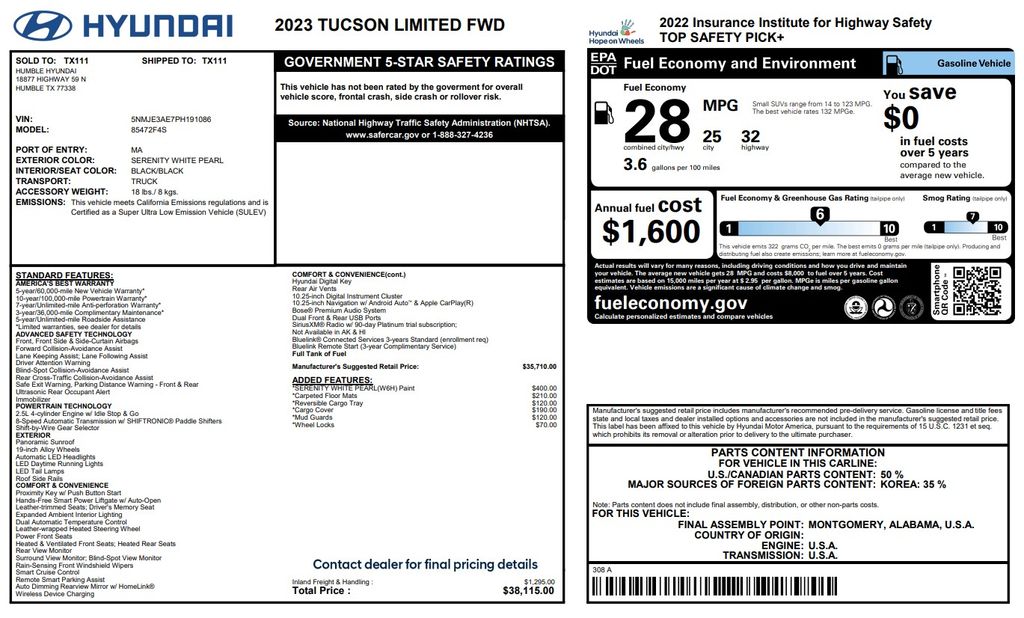 2023 Hyundai Tucson Limited features a 2.5L 4-cylinder Engine w/ Idle Stop & Go!