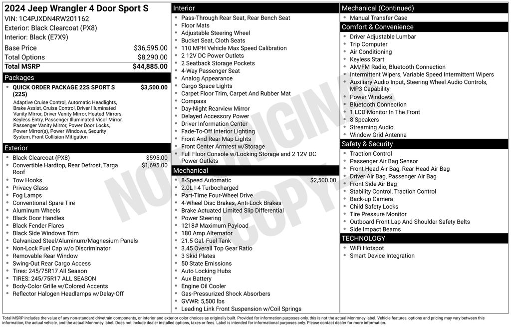 New Price! This 2024 Black Clearcoat Jeep Wrangler Sport S 4WD is well equipped and includes these features and benefits: