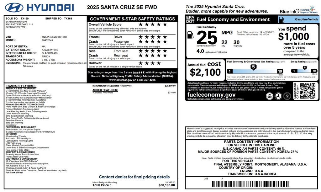 2025 Hyundai Santa Cruz SE features a Smartstream 2.5L 4-Cylinder Engine!