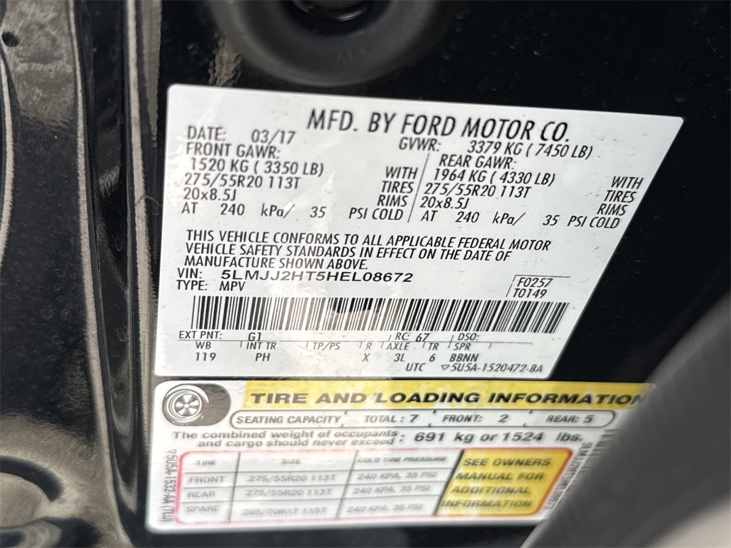 200A Select, Ebony Leather, 14 Speakers, 3.73 Rear Axle Ratio, 3rd row seats: split-bench, 4-Wheel Disc Brakes, ABS brakes, Adjustable pedals, Air Conditioning, Alloy wheels, AM/FM radio: SiriusXM, Auto-dimming door mirrors, Auto-dimming Rear-View mirror, Auto-leveling suspension, Automatic temperature control, Bumpers: body-color, CD player, Compass, Delay-off headlights, Driver door bin, Driver vanity mirror, Dual front impact airbags, Dual front side impact airbags, DVD-Audio, Electronic Stability Control, Emergency communication system: SYNC 3 911 Assist, Exterior Parking Camera Rear, Four wheel independent suspension, Front anti-roll bar, Front Bucket Seats, Front Center Armrest, Front dual zone A/C, Front License Plate Bracket, Front reading lights, Fully automatic headlights, Garage door transmitter: HomeLink, Genuine wood console insert, Genuine wood dashboard insert, Genuine wood door panel insert, Heated door mirrors, Heated front seats, Heated rear seats, High-Intensity Discharge Headlights, Illuminated entry, Leather steering wheel, Low tire pressure warning, Memory seat, Navigation System, Outside temperature display, Overhead airbag, Overhead console, Panic alarm, Passenger door bin, Passenger vanity mirror, Pedal memory, Power door mirrors, Power driver seat, Power Liftgate, Power Moonroof, Power passenger seat, Power steering, Power windows, Premium audio system: THX II, Premium Leather Low Back Bucket Seats, Radio data system, Radio: HD w/Single CD/DVD/MP3 Player, Rain sensing wipers, Rear air conditioning, Rear anti-roll bar, Rear audio controls, Rear reading lights, Rear window defroster, Rear window wiper, Reclining 3rd row seat, Remote keyless entry, Roof rack, Security system, SiriusXM Satellite Radio, Speed control, Speed-sensing steering, Speed-Sensitive Wipers, Steering wheel memory, Steering wheel mounted audio controls, SYNC 3 Communications & Entertainment System, Tachometer, Telescoping steering wheel, Tilt steering wheel, Traction control, Trip computer, Turn signal indicator mirrors, Variably intermittent wipers, Ventilated front seats, and Wheels: 20" Ultra Brite Machined Aluminum.