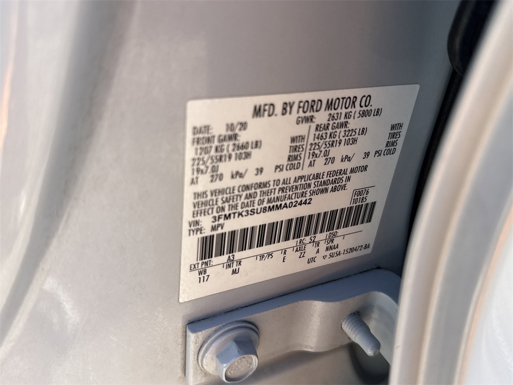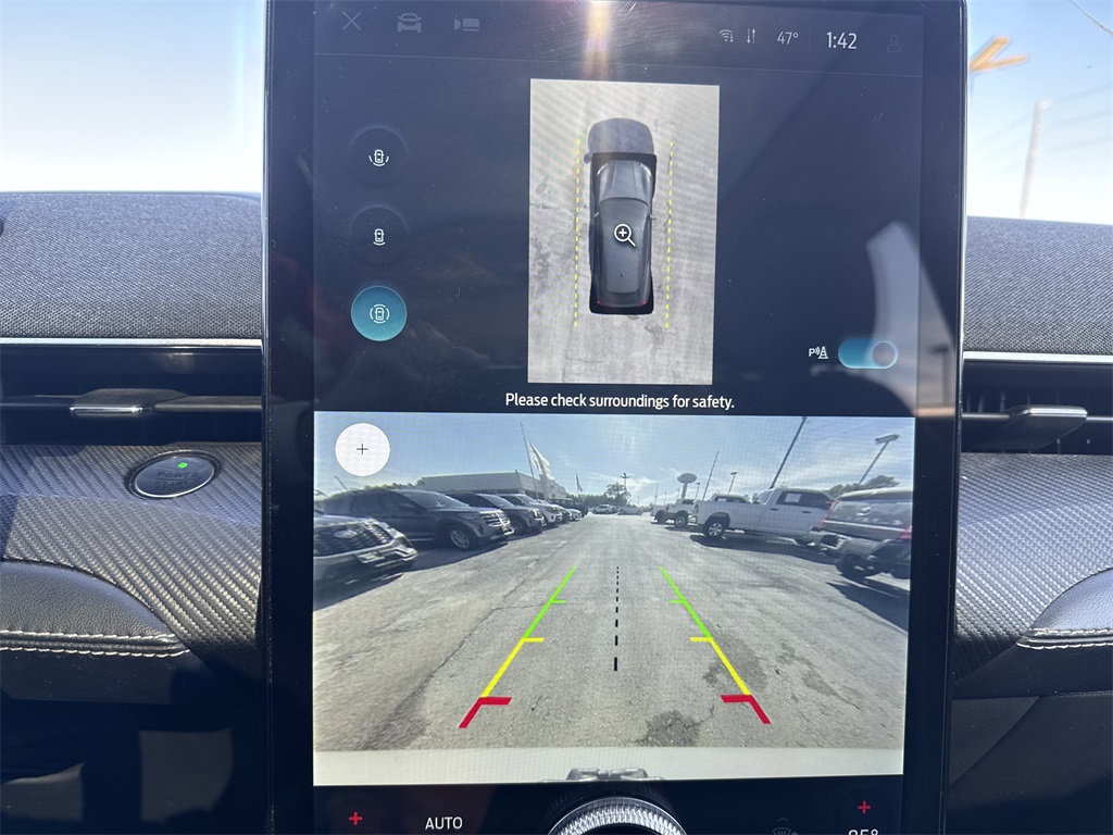 lled) (Cargo Area Protector and Front & Rear Floor Liners), 10 Speakers, 4-Wheel Disc Brakes, ABS brakes, Air Conditioning, Alloy wheels, AM/FM radio: SiriusXM, AM/FM Stereo, Apple CarPlay/Android Auto, Auto High-beam Headlights, Auto-dimming Rear-View mirror, Automatic temperature control, Axle Ratio: 9.05, Brake assist, Bumpers: body-color, Compass, Delay-off headlights, Driver door bin, Driver vanity mirror, Dual front impact airbags, Dual front side impact airbags, Electronic Stability Control, Emergency communication system: 911 Assist, Exterior Parking Camera Rear, Four wheel independent suspension, Front anti-roll bar, Front Bucket Seats, Front Center Armrest, Front dual zone A/C, Front License Plate Bracket, Front reading lights, Fully automatic headlights, Garage door transmitter, Heated door mirrors, Heated front seats, Heated Perforated ActiveX Bucket Seats, Heated steering wheel, Illuminated entry, Knee airbag, Low tire pressure warning, Memory seat, Navigation system: Connected Navigation, Occupant sensing airbag, Outside temperature display, Overhead airbag, Overhead console, Panic alarm, Passenger door bin, Passenger vanity mirror, Power door mirrors, Power driver seat, Power Liftgate, Power passenger seat, Power steering, Power windows, Radio data system, Rain sensing wipers, Rear anti-roll bar, Rear seat center armrest, Rear side impact airbag, Rear window defroster, Rear window wiper, Remote keyless entry, Security system, SiriusXM Radio w/360L, Speed control, Speed-sensing steering, Speed-Sensitive Wipers, Split folding rear seat, Spoiler, Steering wheel mounted audio controls, SYNC 4A w/Enhanced Voice Recognition, Telescoping steering wheel, Tilt steering wheel, Traction control, Trip computer, Turn signal indicator mirrors, Variably intermittent wipers, and Wheels: 19" Machined-Face Aluminum.