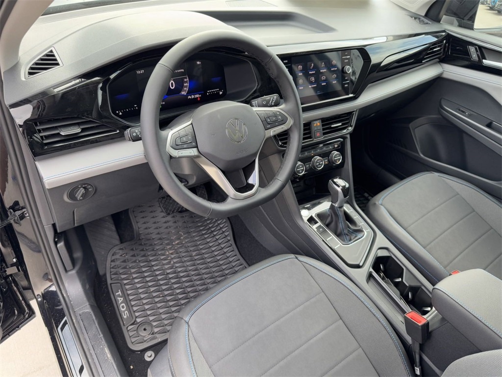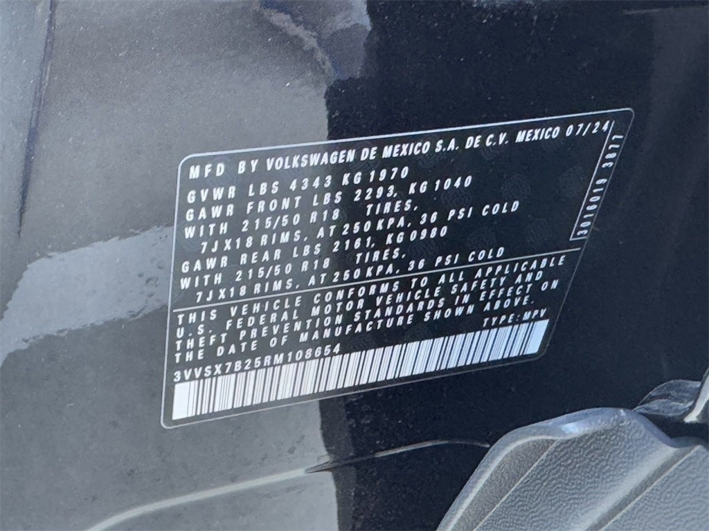 oth Seating Surfaces, Compass, Delay-off headlights, Driver door bin, Driver vanity mirror, Dual front impact airbags, Dual front side impact airbags, Electronic Stability Control, Emergency communication system: VW Car-Net Safe & Secure 5-year, Exterior Parking Camera Rear, Front anti-roll bar, Front Bucket Seats, Front Center Armrest, Front dual zone A/C, Front reading lights, Front Strut Rear Torsion Beam Suspension, Front wheel independent suspension, Fully automatic headlights, Heated door mirrors, Heated Front Bucket Seats, Heated front seats, Heated steering wheel, Illuminated entry, Leather Shift Knob, Low tire pressure warning, Occupant sensing airbag, Outside temperature display, Overhead airbag, Overhead console, Panic alarm, Passenger door bin, Passenger vanity mirror, Power door mirrors, Power driver seat, Power steering, Power windows, Radio data system, Radio: MIB3 Composition Media AM/FM/HD, Rain sensing wipers, Rear anti-roll bar, Rear seat center armrest, Rear window defroster, Rear window wiper, Remote keyless entry, Roof rack: rails only, Security system, Speed control, Speed-sensing steering, Split folding rear seat, Spoiler, Steering wheel mounted audio controls, Tachometer, Telescoping steering wheel, Tilt steering wheel, Traction control, Trip computer, Variably intermittent wipers, and Wheels: 18" 2-Tone Machined Alloy. 2024 Volkswagen Taos 1.5T SE 4D Sport Utility Black 28/36 City/Highway MPG